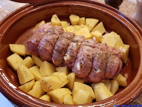 Τώρα το αρνάκι ρολό είναι έτοιμο για το φούρνο. Τοποθετώ το καπάκι στο ταψί. Το βάζω σε έναν προθερμασμένο φούρνο στους 180°C και ψήνω για 1 ώρα και 30 λεπτά. Αφήνω το καπάκι μέχρι το τέλος.