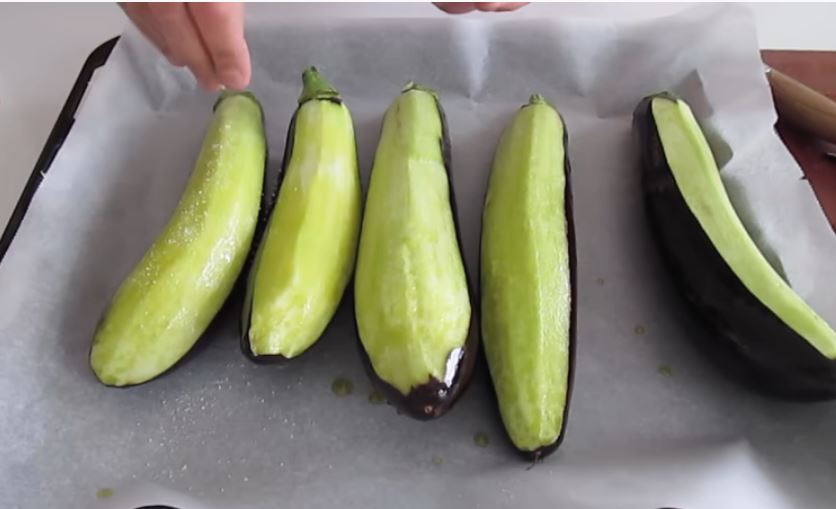 Καθαρίζουμε 5 φλάσκες μακρόστενες μελιτζάνες όπως βλέπετε στη φωτογραφία, τις τοποθετούμε σε ένα ταψί στρωμένο με χαρτί ψησίματος και τις αλείφουμε με λάδι και τις αλατίζουμε.