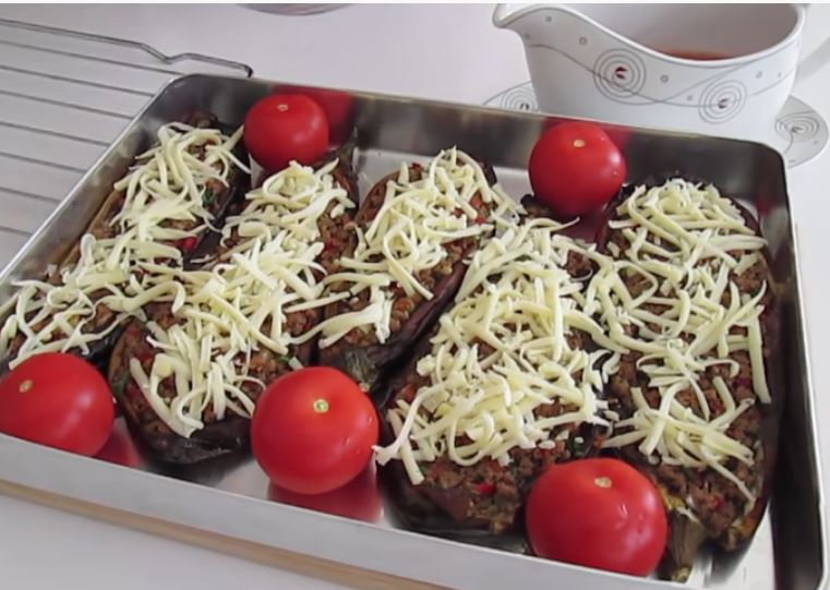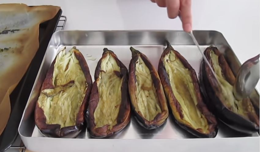 Εφόσον βγάλουμε τις μελιτζάνες με το ταψί από το φούρνο τοποθετούμε τις μελιτζάνες σε άλλο ταψί με ένα κουτάλι της ανοίγουμε να γίνουν σαν βαρκούλες
