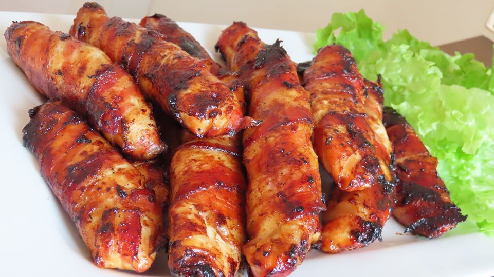 Παίρνω μία μία φέτα μπέικον και τυλίγω κάθε κομμάτι κοτόπουλο και τα βάζω σε ταψί στρωμένο με χαρτί ψησίματος.