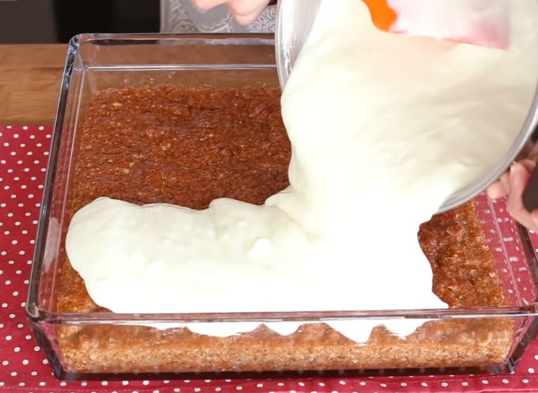 10- Αφού κρυώσει το κέικ, βάλτε την κρέμα και απλώστε την καλά.