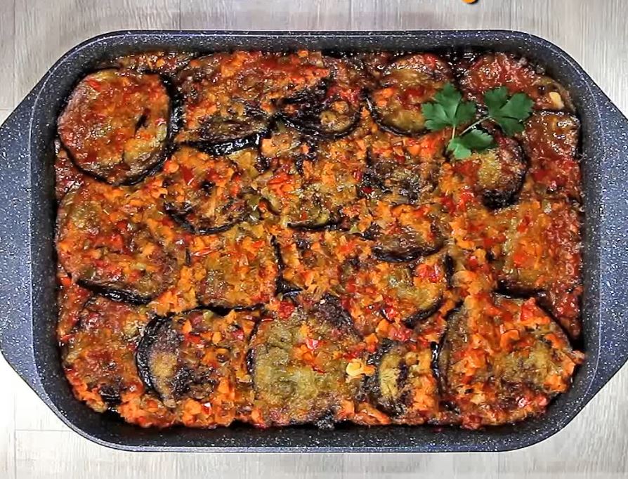 Σε ένα τηγάνι, τακτοποιήστε ένα στρώμα μελιτζάνας, ένα στρώμα τηγανισμένων λαχανικών και ούτω καθεξής έως ότου εξαντληθούν τα υλικά(2 στρώσεις). Ρίχνουμε απο πάνω 2 κουταλιές της σούπας νερό και 1 κσ λάδι και ψήνουμε στους 200 βαθμούς για 40 λεπτά. Σερβίρετε με λεμόνι και φέτα.