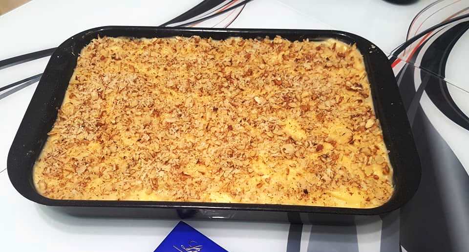 Από πάνω πασπάλισα το κέικ μπισκότου με αλεσμένα καρύδια, αλλά μπορείτε να το γαρνίρετε κατά βούληση με άλλους ξηρούς καρπούς ή σοκολάτα.