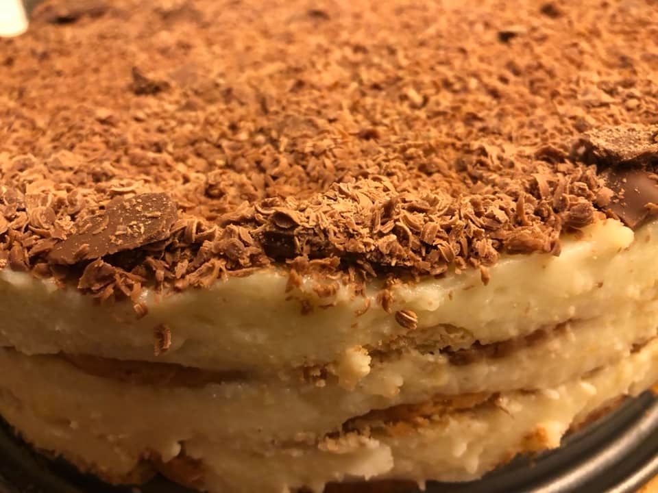 Μόλις είναι έτοιμη η κρέμα προσθέτουμε το βούτυρο να λιώσει. Στη συνέχεια εναλλάξ μπισκότα, κρέμα, αλεσμένα καρύδια, μπισκότα, κρέμα, αλεσμένα καρύδια.