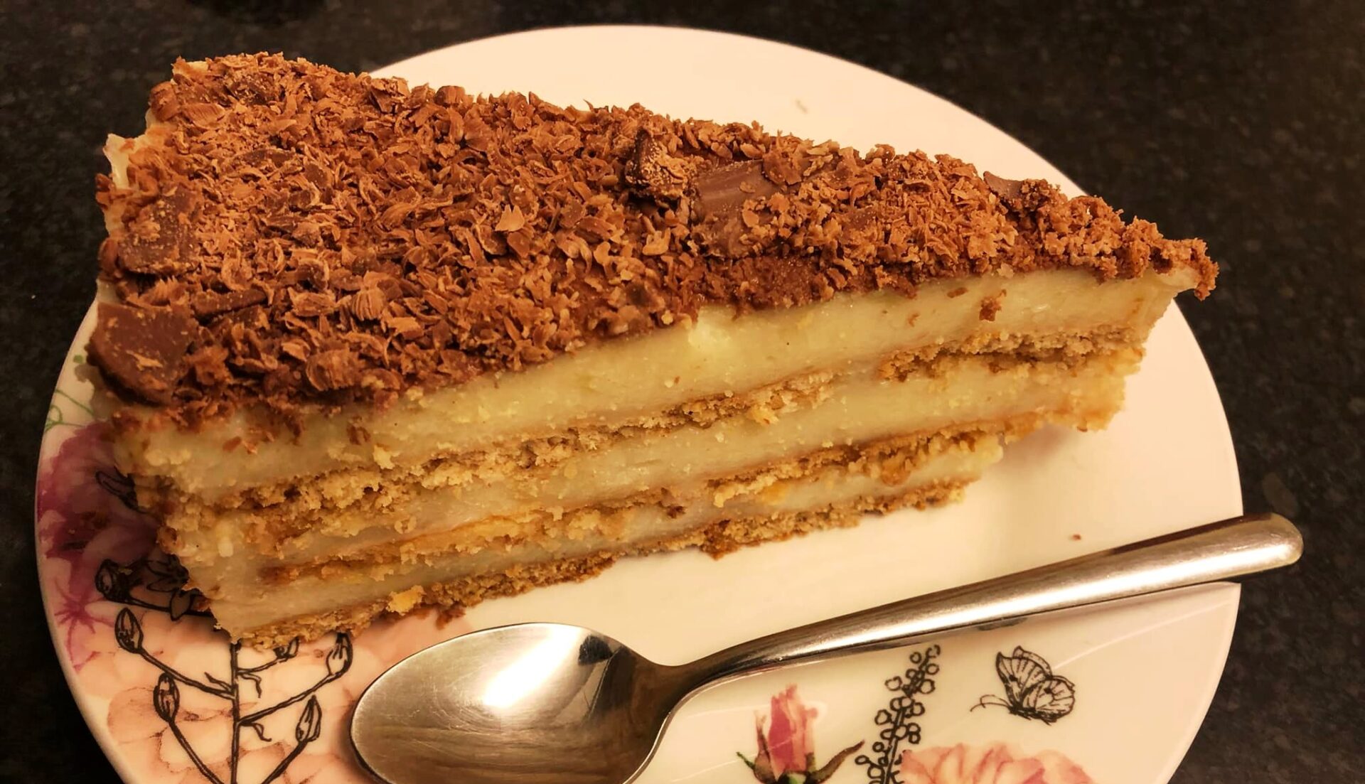 Μόλις είναι έτοιμη η κρέμα προσθέτουμε το βούτυρο να λιώσει. Στη συνέχεια εναλλάξ μπισκότα, κρέμα, αλεσμένα καρύδια, μπισκότα, κρέμα, αλεσμένα καρύδια.