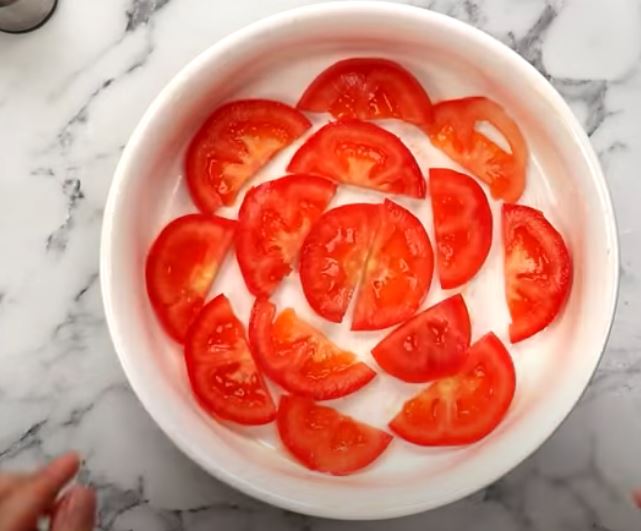 Στρώνουμε με τις μισές ντομάτες την βάση από ένα ταψάκι 28 εκ