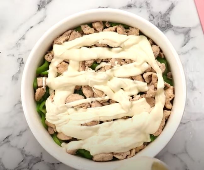 Απλώνουμε την μπεσαμελ πάνω από το κοτόπουλο και πάνω από την μπεσαμελ