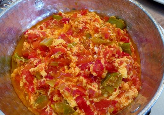 Ζεσταίνετε το βούτυρο και το ελαιόλαδο σε ένα τηγάνι. Προσθέστε τα κρεμμυδάκια, τις ντομάτες, την πιπεριά και το κόκκινο πιπέρι και ανακατέψτε καλά. Σπάστε  τα αυγά σε ένα μπολ και χτυπήστε τα καλά με ένα πηρούνι. Προσθέστε τη φέτα στα χτυπημένα αυγά και ανακατέψτε καλά. Ρίξτε το μίγμα των αυγών  στο τηγάνι και ανακατέψτε το καλά μέχρι να ψηθούν τα αυγά, διατηρώντας το χυμό τους. Ρίχνουμε αλάτι και  μαύρο πιπέρι.