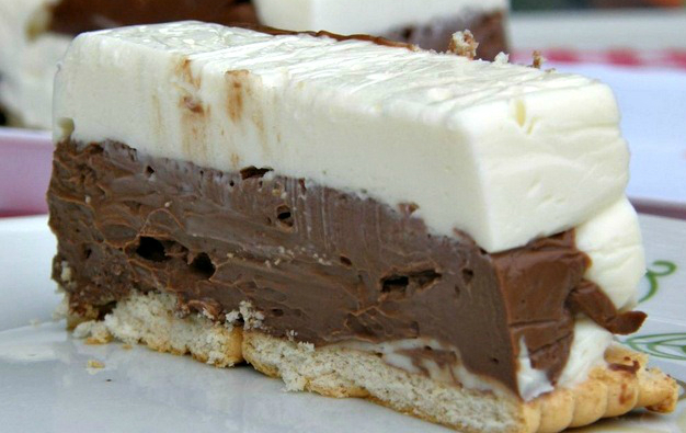 Στο κάτω μέρος του ταψιού βάζουμε τα μπισκότα που είναι εμποτισμένα σε κρύο γάλα και