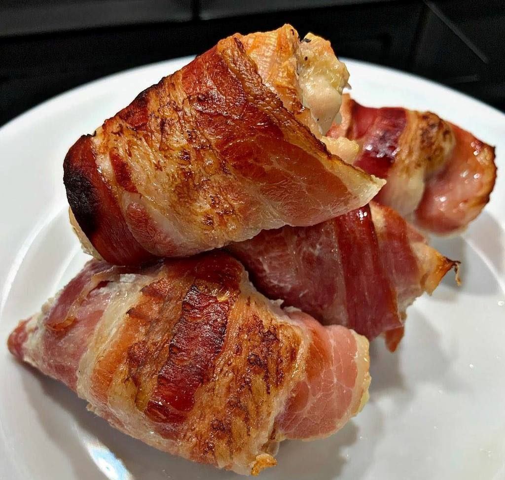 Τυλίγουμε το ρολό με μια λωρίδα μπέικον και το καρφώνουμε με μια οδοντογλυφίδα για να μην ανοίξει.