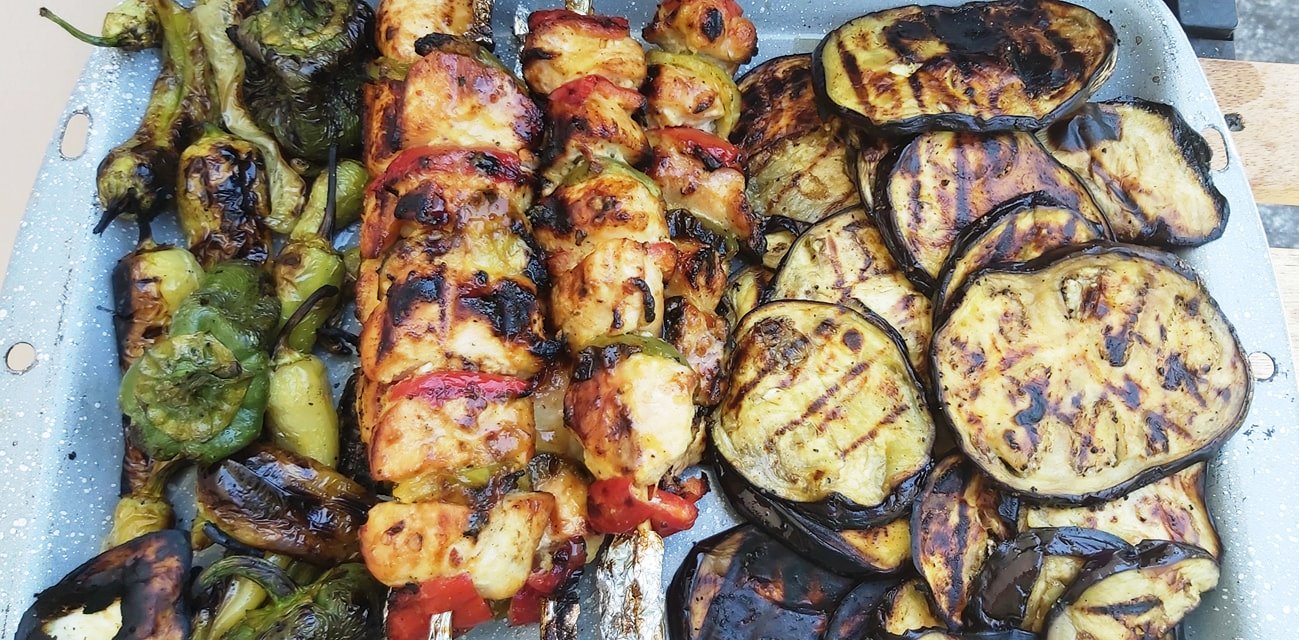 Σουβλάκια μαριναρισμένα με μέλι & ψητά λαχανικά