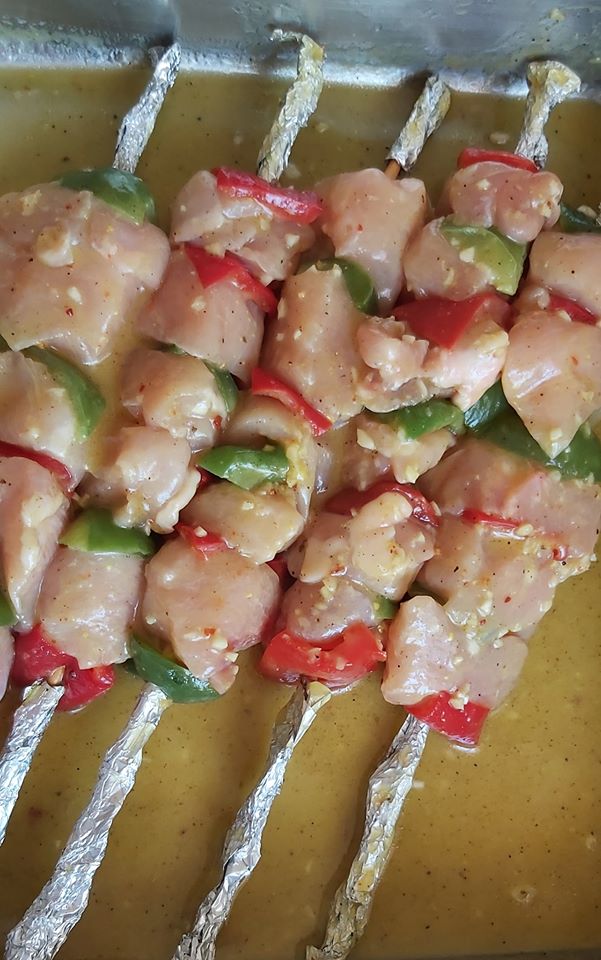 Στις φωτογραφίες μπορείτε να δείτε ότι καλύπτω τα καλαμάκια σε αλουμινόχαρτο. Είναι επειδή τα αγόρασα έτοιμα τα σουβλάκια και δεν είχα το χρόνο να βάλω τα καλαμακια στο νερό – έτσι δεν θα καουν στη σχάρα και θα σπασουν.