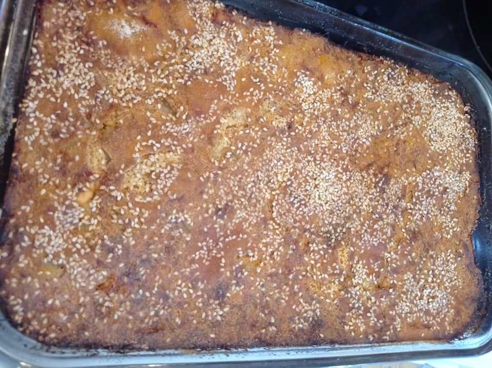 Παίρνω ένα πυρέξ, ρίχνω λίγο ελαιόλαδο έτσι με το ροι, βοηθάω με το χέρι μου να πάει παντού, ραντίζω με λίγο σιμιγδάλι ψιλό, ρίχνω το μείγμα μέσα, από πάνω πάλι λίγο με το ροι λάδι, πάλι ραντίζω με λίγο σιμιγδάλι και βάζω στο φούρνο να ψηθεί για 1 ώρα στους 180 αντιστάσεις. Ραντίζω και με λίγο σουσάμι από πάνω.