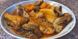 Τις αλατοπιπερώνουμε ρίχνουμε λίγη ρίγανη λίγη μουστάρδα,τις 3 σκελίδες σκόρδο, το υπόλοιπο λάδι τις ανακατεύουμε και στη συνέχεια προσθέτουμε το κρέας με όλο το υγρό που έχει βγάλει όλη τη νύχτα. Αν θέλουμε περισσότερο ζουμάκι προσθέτουμε και ένα ποτήρι νερό. Στρώνουμε καλά στο ταψί και ψήνουμε σε προθερμασμένο φούρνο στους 180 βαθμούς Κελσίου στις αντιστάσεις για περίπου μιάμιση ώρα!!!!