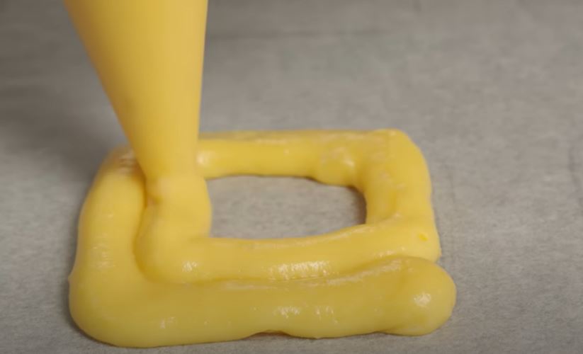 Αδειάζουμε τη ζύμη σε κορνέ.Βάζουμε αντικολλητικό χαρτί στο ταψί κάνουμε τετράγωνο σχήμα όπως βλέπετε στη φώτο και το γεμίζουμε με την κρέμα.