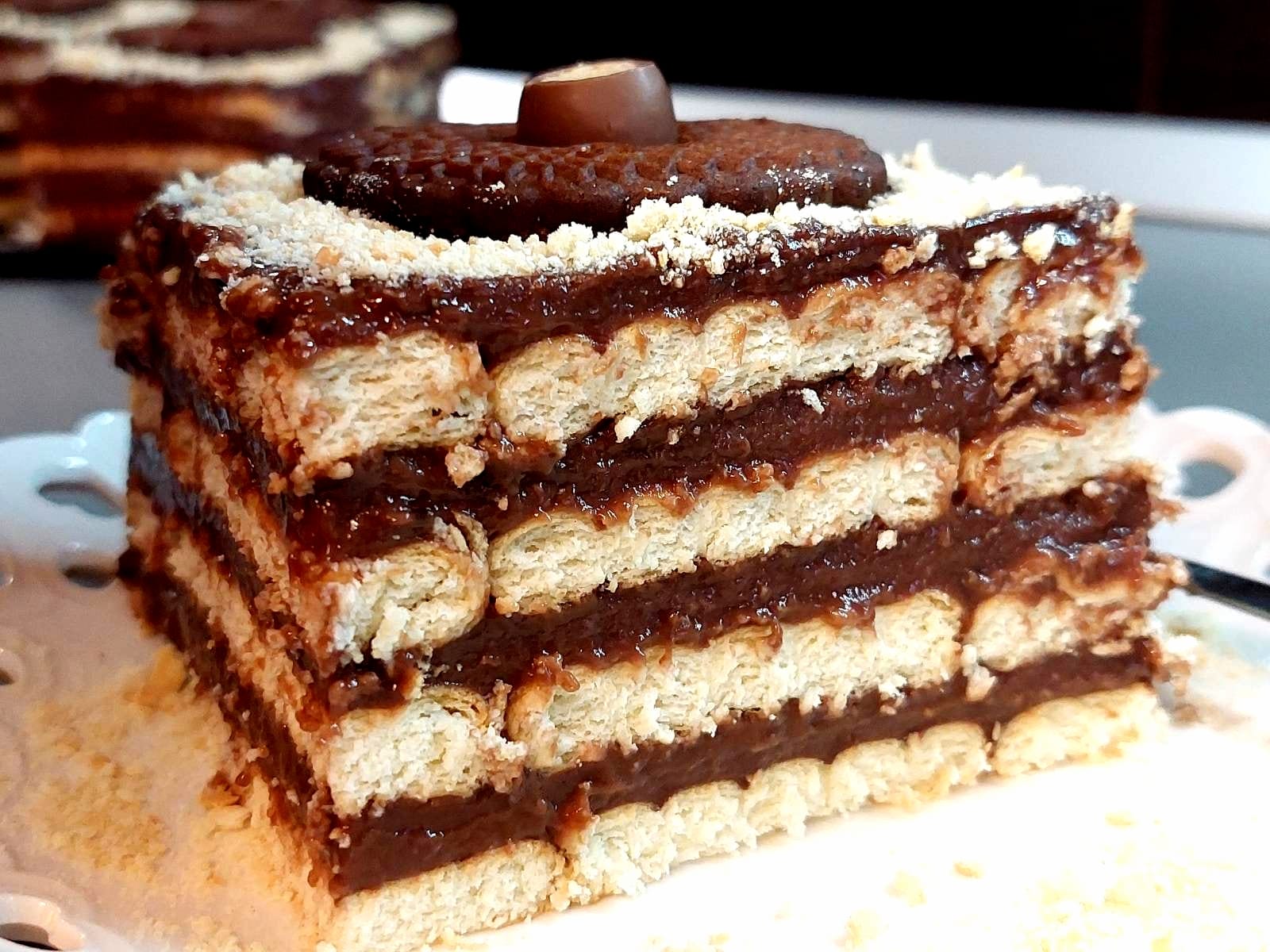 μπισκότα. Επαναλαμβάνουμε τη διαδικασία μέχρι να έχουμε 4 στρώσεις μπισκότων. Απλώνουμε το τελευταίο μέρος της κρέμας από πάνω και στα πλαϊνά του γλυκού και φροντίζουμε να φτιάξουμε λείες και επίπεδες τις επιφάνειες του.