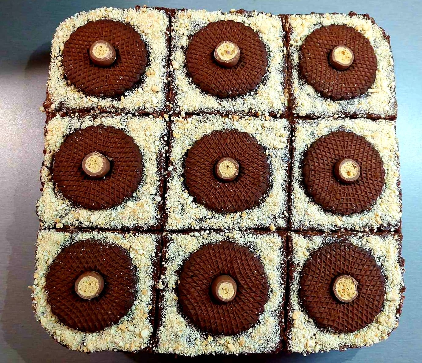Κοβουμε την τουρτα σε κύβους πασπαλίζουμε με αμυγδαλάκι ή καρύδι και τοποθετουμε ένα μπισκότο σοκολάτας με τρύπα στην μέση και διακοσμουμε με ένα κομμένο σοκολατακι.
