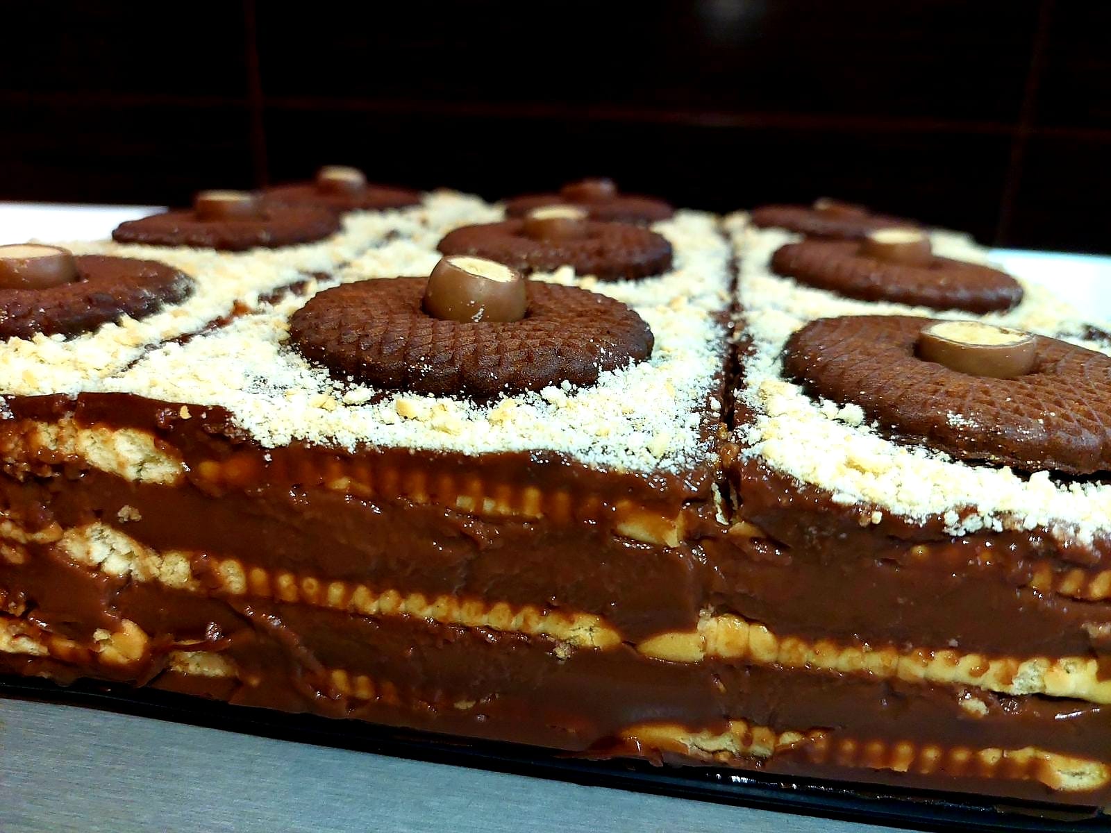 μπισκότα. Επαναλαμβάνουμε τη διαδικασία μέχρι να έχουμε 4 στρώσεις μπισκότων. Απλώνουμε το τελευταίο μέρος της κρέμας από πάνω και στα πλαϊνά του γλυκού και φροντίζουμε να φτιάξουμε λείες και επίπεδες τις επιφάνειες του.