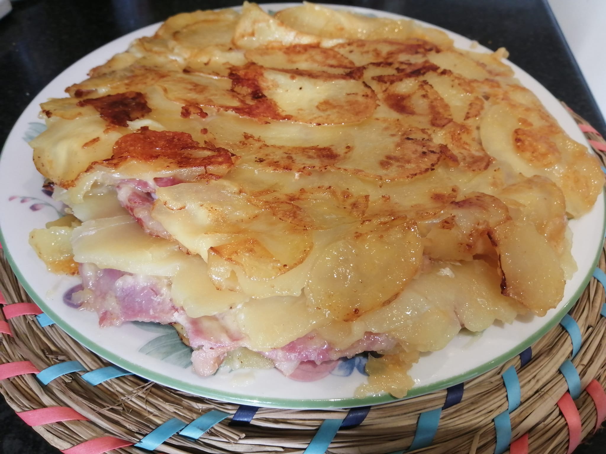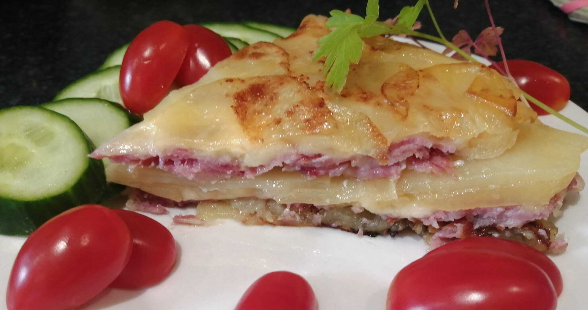 Έκοψα τις πατάτες σε λεπτές ροδέλες, τακτοποίησα μερικές σε λαδωμένο τηγανι, από πάνω έβαλα προσούτο, τριμμένο τυρί, πάλι πατάτες,