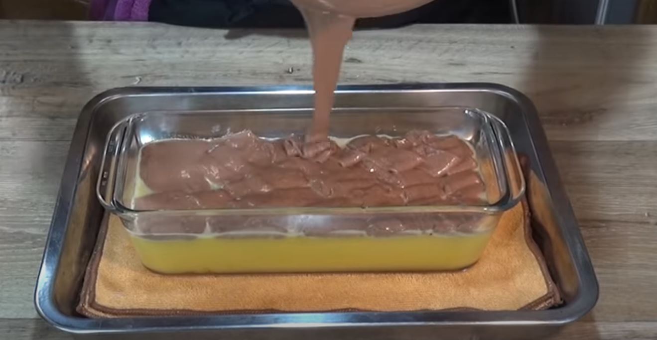 Αδειάζουμε το μείγμα κακάο στην φόρμα του κέικ πάνω από το μείγμα πορτοκαλιού