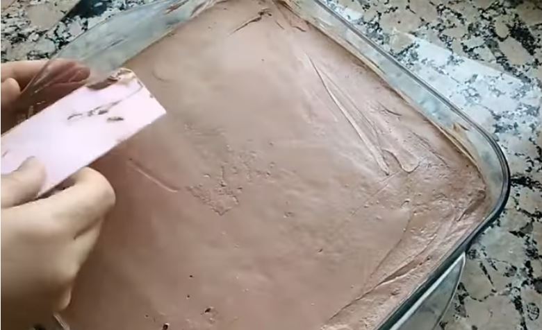 Βουτυρώνουμε ένα τετράγωνο πυρέξ και αδειάζουμε μέσα στο πυρέξ όλο το υγρό μείγμα και το απλώνουμε, το χτυπάμε λίγο για να φύγουν οι φουσκάλες