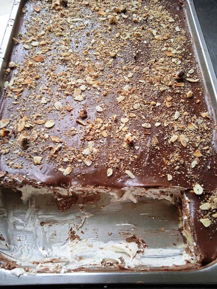 3. Σε ένα τηγάνι καβουρντίζω τα αμύγδαλα και τα περνάω από το μπλέντερ μαζί με τα φουντούκια, τα ρίχνω χοντροκομμένα πάνω από τη λευκή κρέμα. Μετά, λιώνω τη νουτέλα σε μπεν μαρί ή στο μικροκύματα και τη ρίχνω από πάνω.