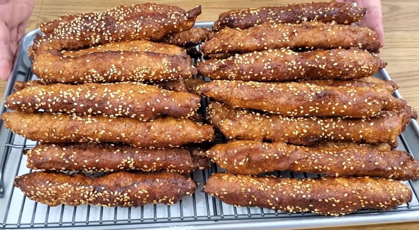 Μόλις Φουσκώσει το πασπαλίζουμε με σουσάμι και βάζουμε μπολικο λάδι να καψει.