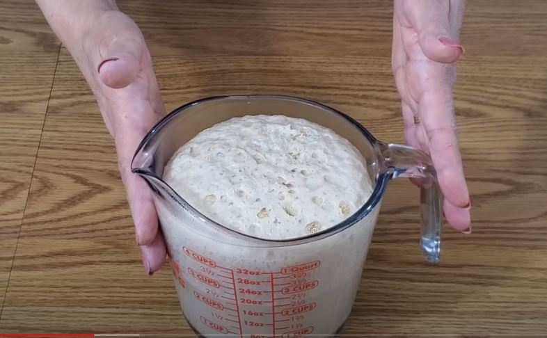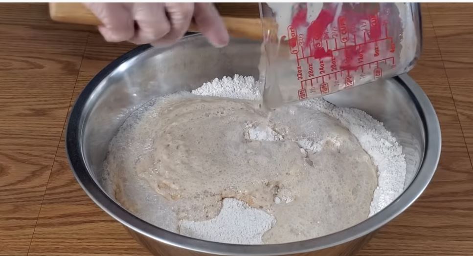 Αδειαζουμε μέσα όλο το μείγμα της μαγιας που έχει ενεργοποιηθεί και ανακατευουμεμε μία μαριζ
