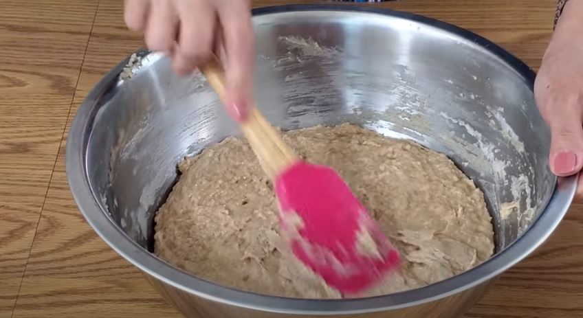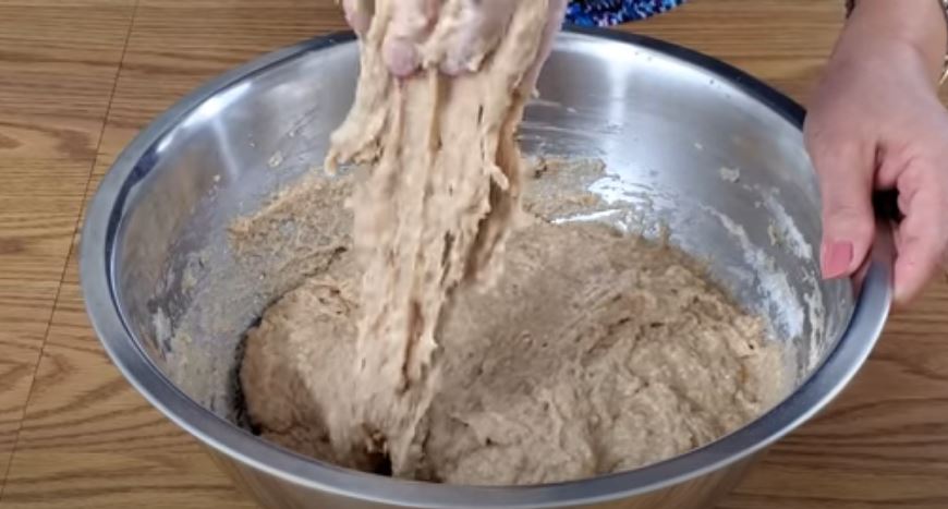 μέχρι να πάρουμε μία συνοχή ζύμης και συνεχίσουμε και ζυμώνουμε με τα χέρια μέχρι