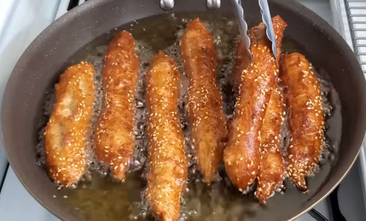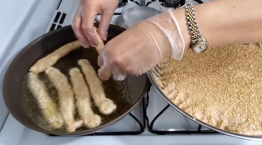 Παίρνουμε μικρές δόσεις τα πλάθουμε σε μακρόστενα “δαχτυλα” και τα τηγανίζουμε