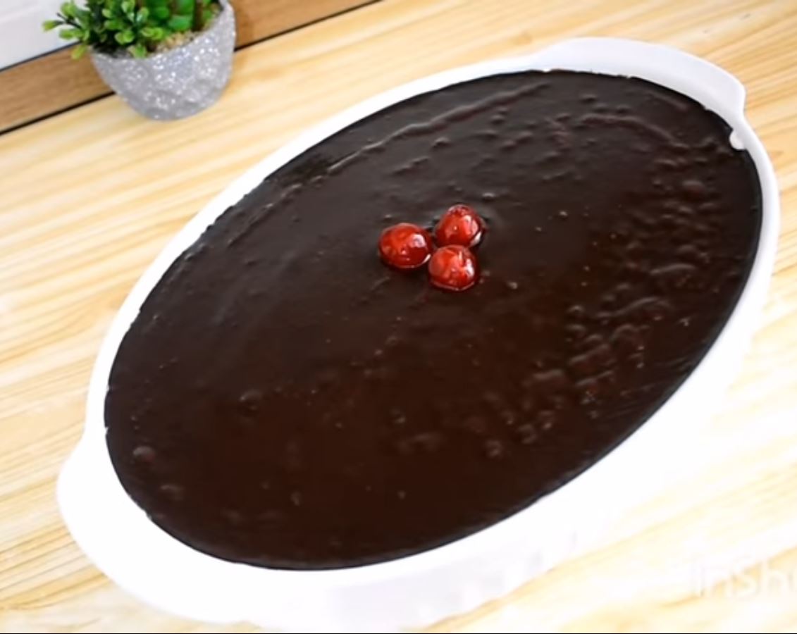 Αφήστε το μείγμα να κρυώσει λίγο και μετά στρώνουμε την σοκολάτα πάνω από την σαντιγί διακοσμούμε με κεράσι ή καρύδια και είναι έτοιμο το γλυκό μας
