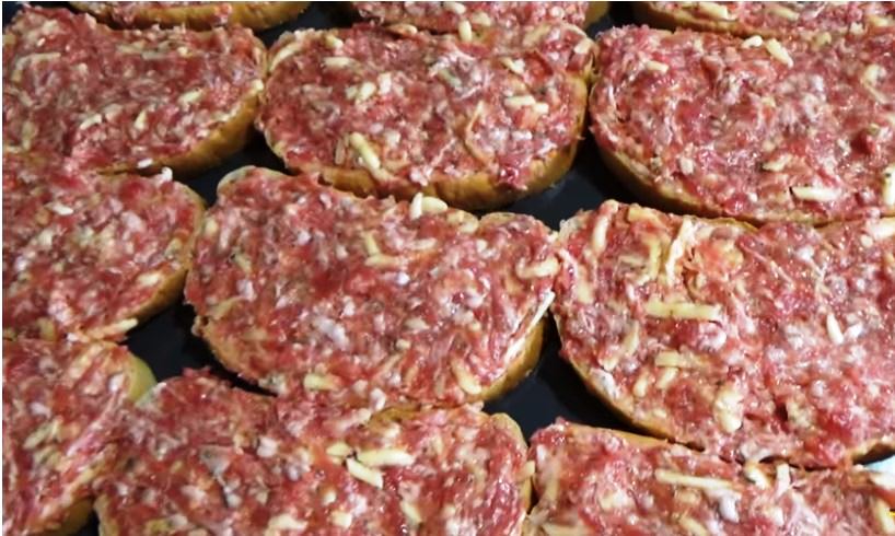 Τρίβουμε το χύμα κίτρινο τυρί . Καρυκεύστε τον κιμά με αλάτι, πιπέρι, πάπρικα και δυόσμο. Προσθέστε το αυγό και το κίτρινο τυρί και ζυμώστε όλα τα προϊόντα. Απλώστε τις φέτες με το μείγμα που προκύπτει.