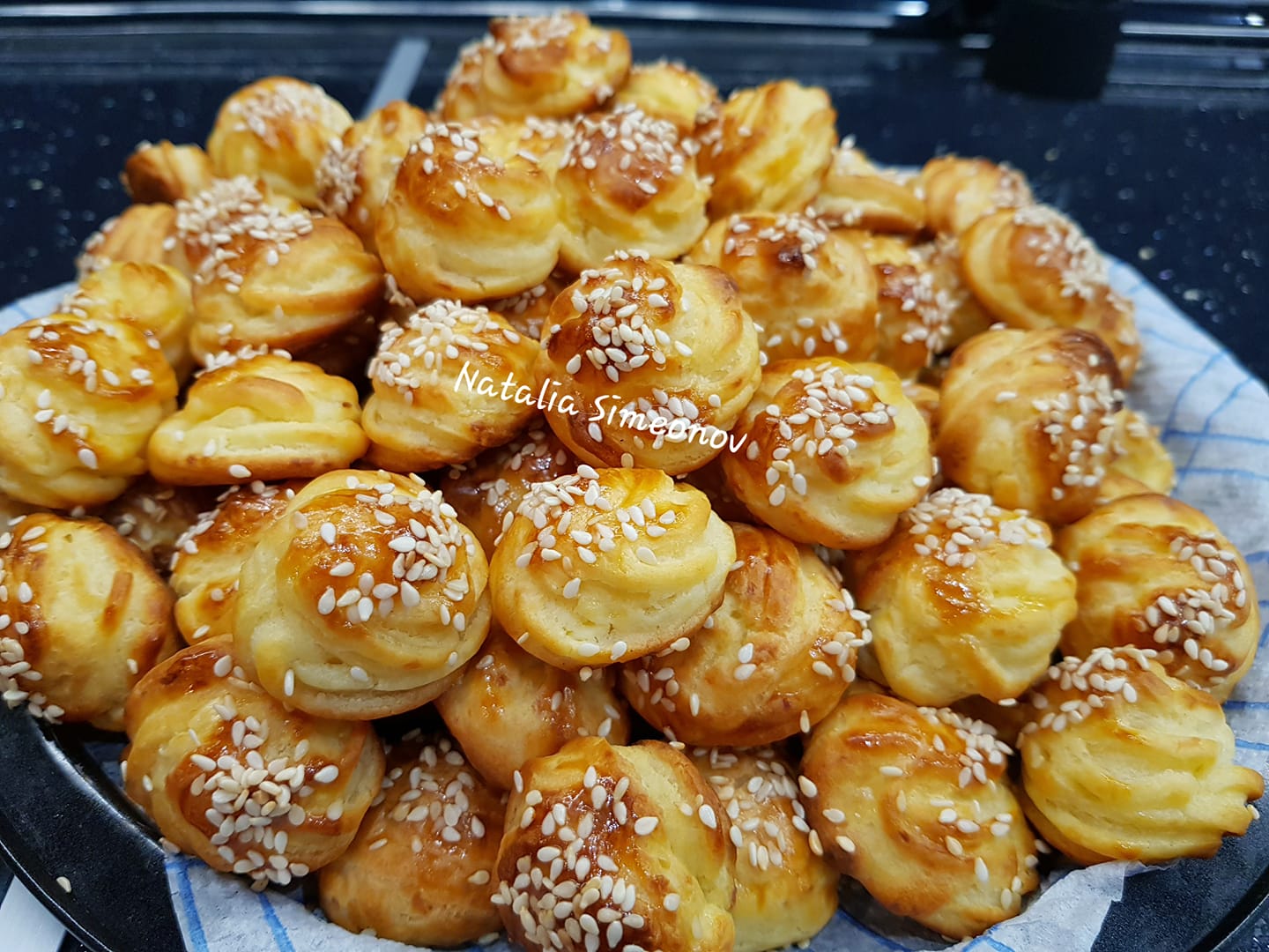 Από το μείγμα που προκύπτει (σε χαρτί ψησίματος) με σακούλα ζαχαροπλαστικής φτιαχτε με το κατάλληλο στόμιο μικρές μπάλες (ή τριαντάφυλλα) με διάμετρο περίπου 2 εκ. Αλείψτε με κρόκο αυγού και προαιρετικά πασπαλίζετε με κύμινο ή σουσάμι. Ψήνουμε σε ένα δυνατό φούρνο μέχρι να ροδίσουν. Έψησα με τον ίδιο τρόπο που ψήνω εκλέρ, δείτε τις συμβουλές ψησίματος παραπάνω.
