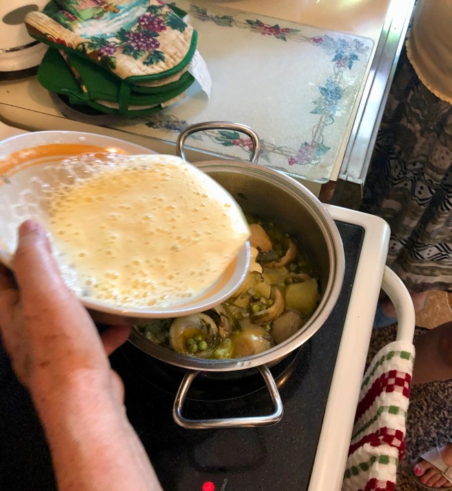 Ρίξτε τη σάλτσα αυγού με λεμόνι στην κατσαρόλα με τη σούπα. Ανακινήστε απαλά το δοχείο, ώστε η σάλτσα αυγού-λεμονιού να διασπαρεί ομοιόμορφα σε όλα τα λαχανικά.
