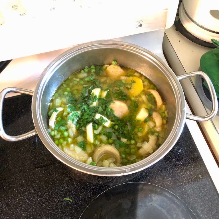 Προσθέστε την ψιλοκομμένη μέντα και το μαϊντανό, καθώς και το αλάτι και το πιπέρι. Καλύψτε και μαγειρέψτε για 30 – 45 λεπτά ανακατεύοντας περιστασιακά.