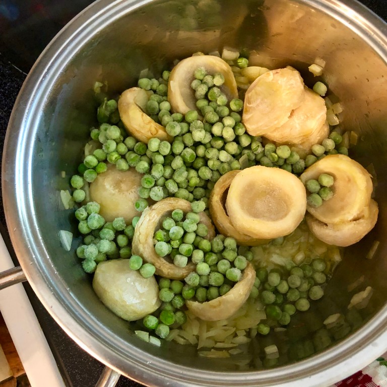 Στο δοχείο προσθέτουμε τις καρδιές αγκινάρας, τον αρακα και τις πατάτες.