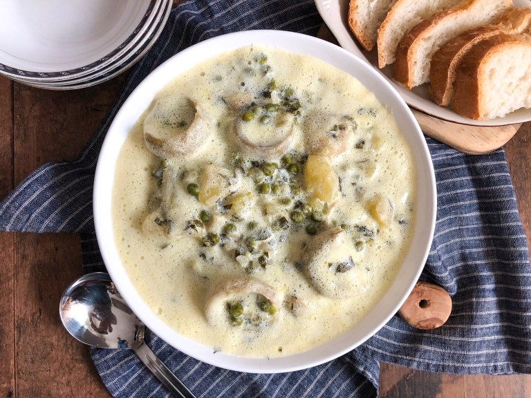 Χρησιμοποιήστε μια κουτάλα για να τοποθετήσετε περίπου 1 φλιτζάνι ζωμό σε ένα μικρό μπολ. Αφήνω στην άκρη.