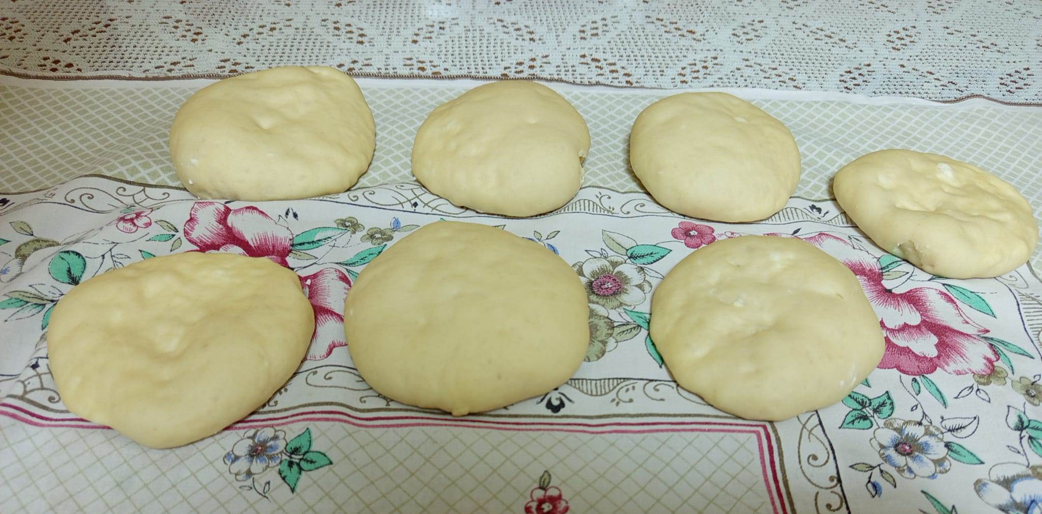 Πάρτε μικρά κομμάτια από τη ζύμη, ανοίξτε τα με τα χέρια σας σε λεπτά στρογγυλά φύλλα.