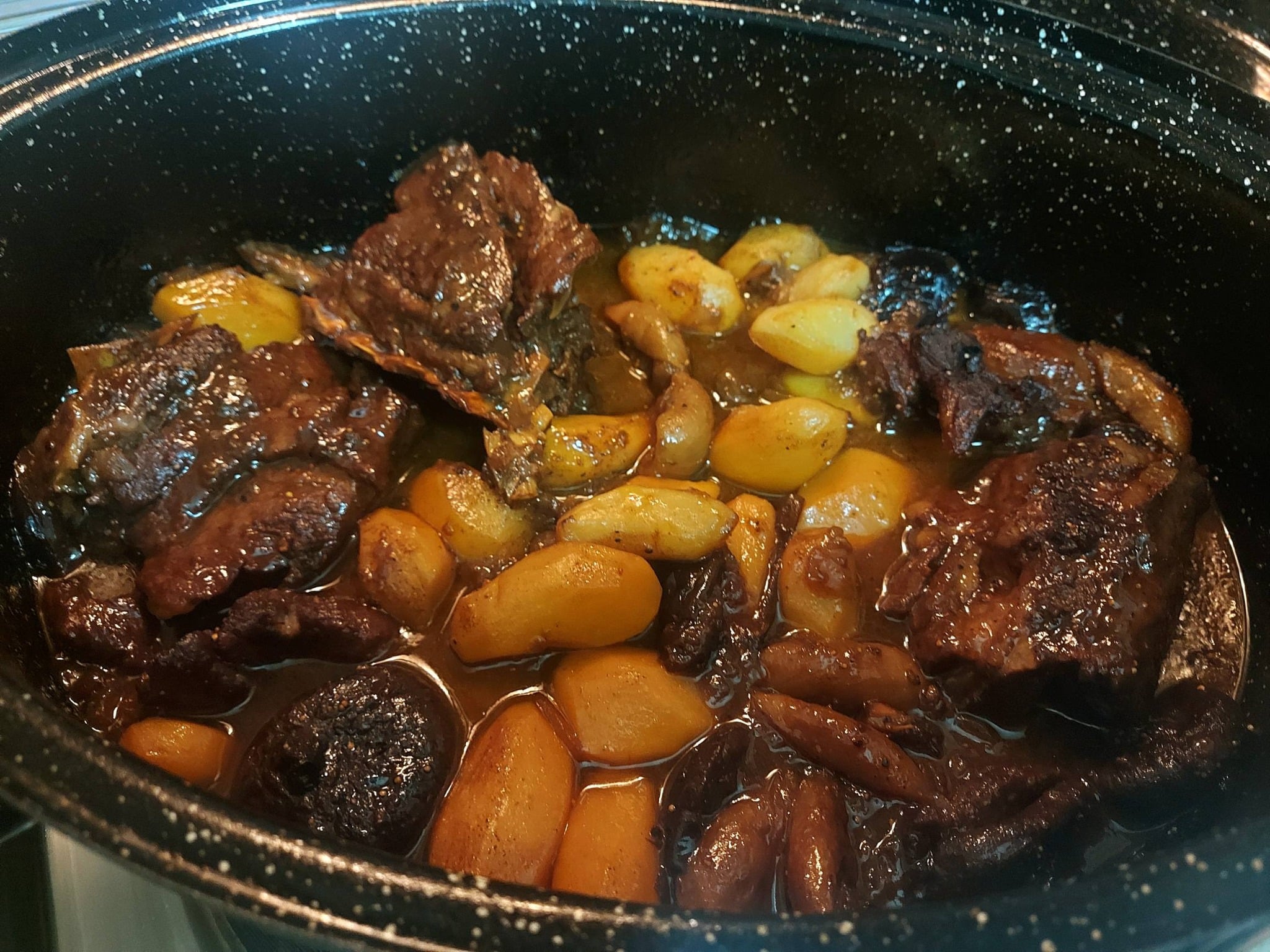 Ψήνουμε συνολικά για 2 ώρες Στα πρώτα 30 λεπτά του ψησίματος ανοίγουμε τη γάστρα και προσθέτουμε τις baby potatoes οι οποίες θα ψηθούν μέσα στη μελωμένη σάλτσα και θα απορροφήσουν όλα τα αρώματα. Συνεχίζουμε το ψήσιμο μέχρι το κρέας να λιώνει και οι πατάτες να μαλακώσουν τελείως. Σερβίρουμε ζεστό με τη συνοδεία της πλούσιας σάλτσας του για εσάς