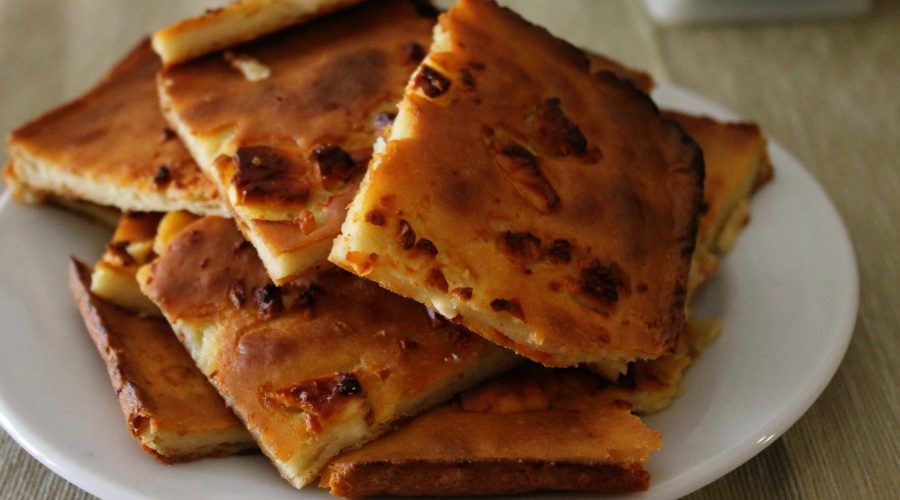 - Ρίχνεις τον χυλό στο μεγάλο ταψί και πασπαλίζεις από πάνω την υπόλοιπη φέτα.
