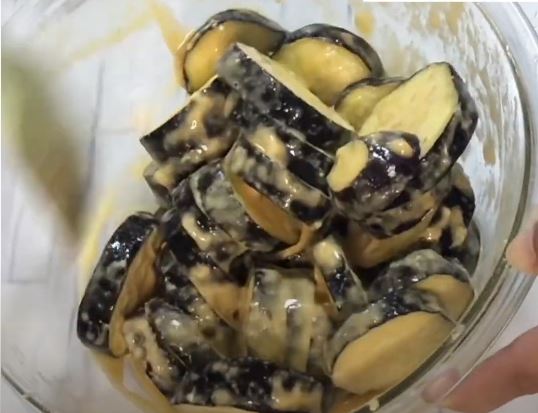 Σε ένα άλλο μπολ, χτυπάω καλά τα 3 αυγά και τα ρίχνω πάνω από τις μελιτζάνες, ανακατεύοντάς τες ώστε να καλυφθούν παντού.