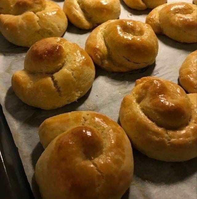 Πλάθουμε τη ζύμη σε σαλιγκάρια ή σε μικρά κουλουράκια.