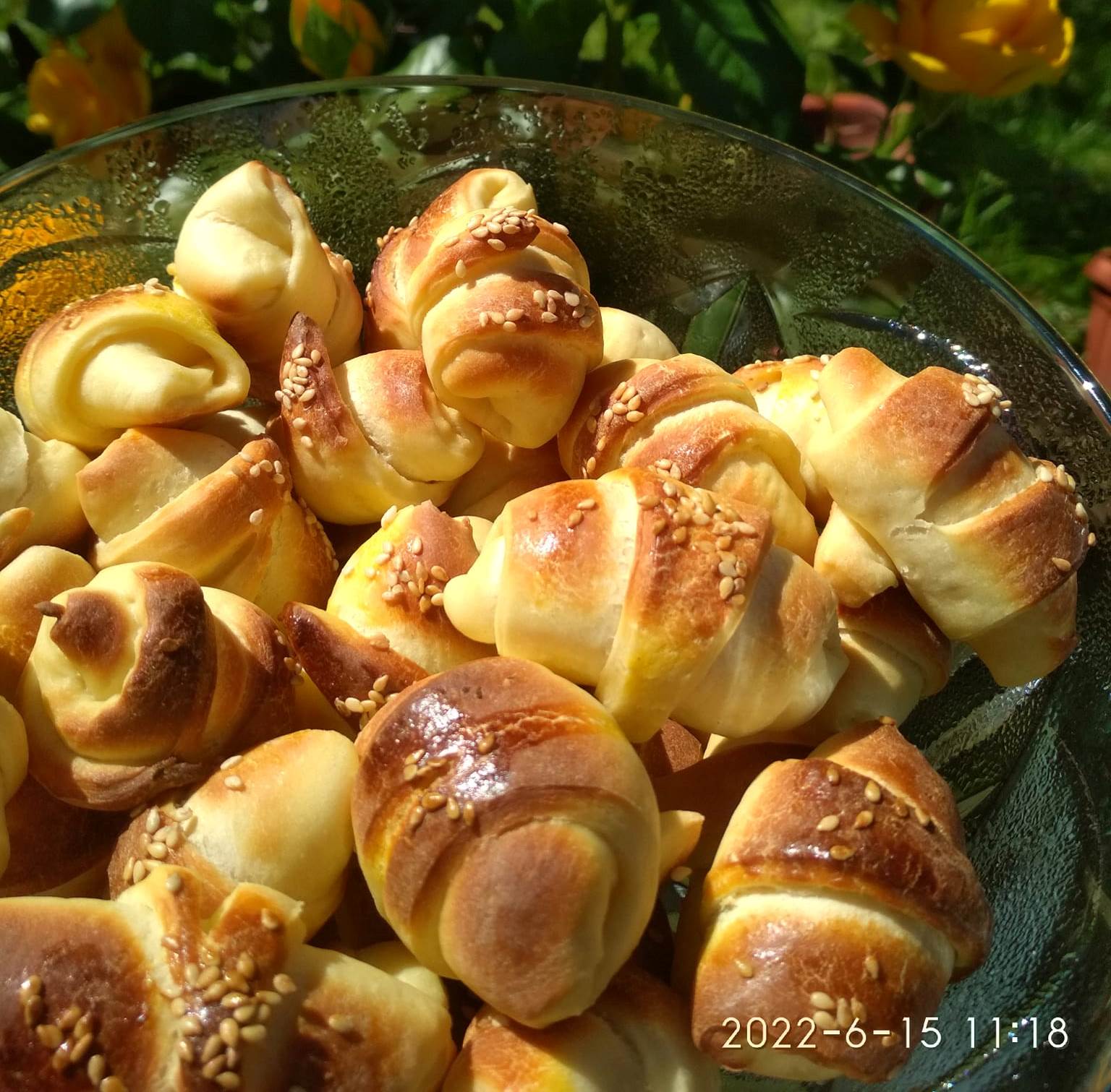 Τα αραδιάζουμε σε ταψί καλυμμένο με χαρτί ψησίματος και τα αφήνουμε να φουσκώσουν ξανά, τα αλείφουμε με χτυπημένο κρόκο αυγού, τα πασπαλίζουμε με σουσάμι και τα ψήνουμε στα 180 βαθμούς