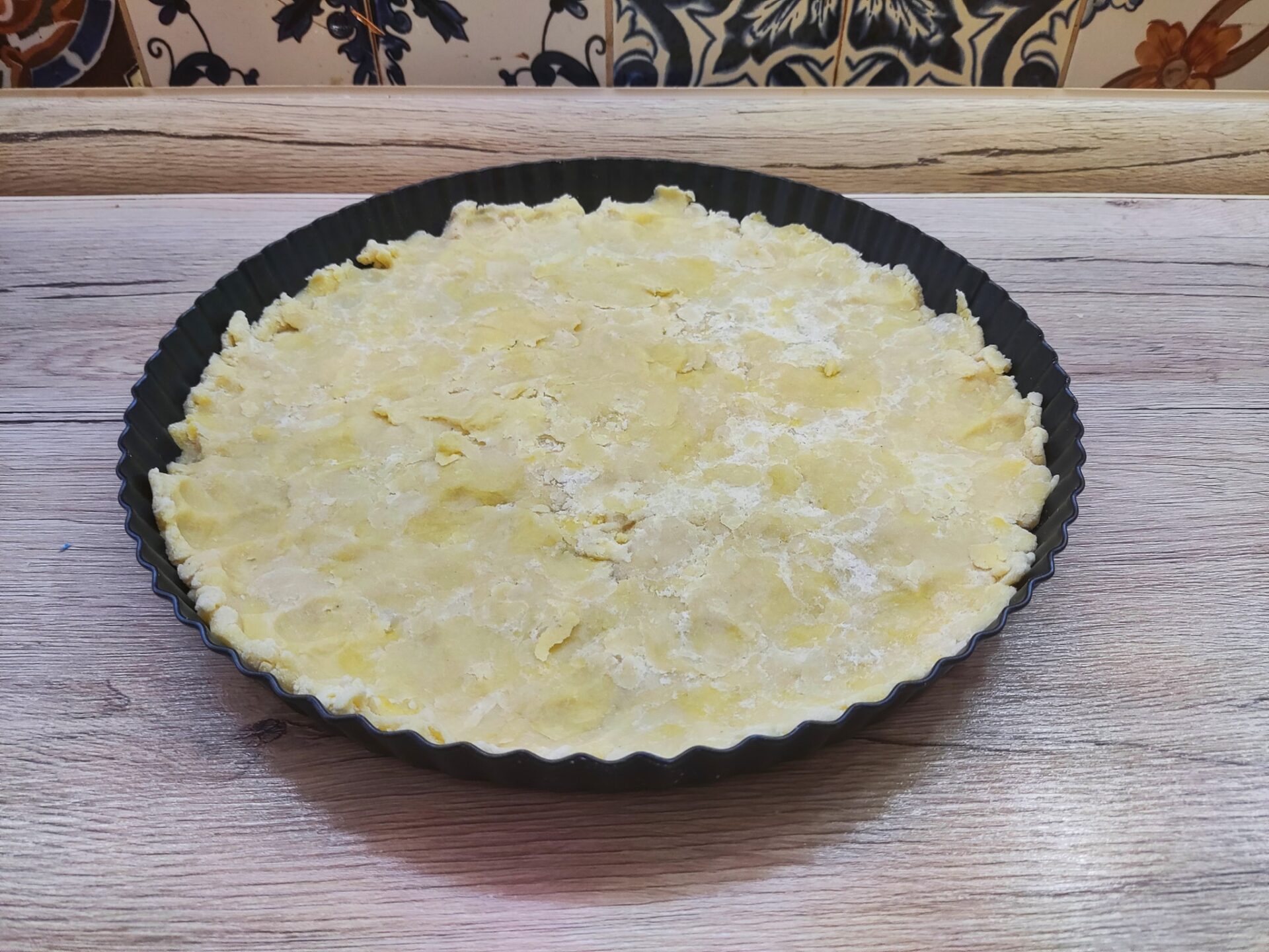 Σε ένα ταψί περίπου 20-22 εκ. κάνουμε μια βάση με τα 3/4 του τριμματος πιέζοντας με ένα κουτάλι.