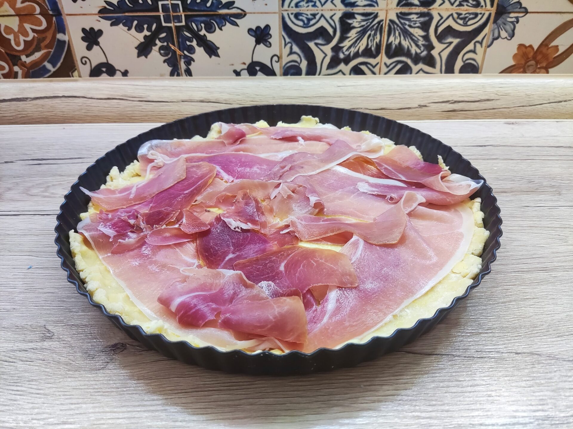 Αφήνουμε να κρυώσει και προσθέτουμε το τυρί. Βάζουμε στη βάση το προσούτο,