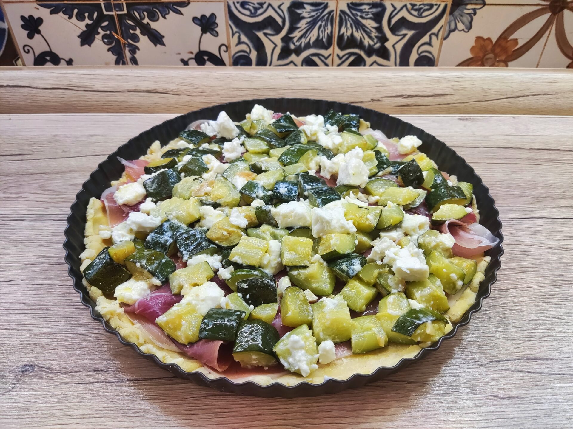 Αλμυρή τάρτα με προσούτο, κολοκυθάκια, τυρί