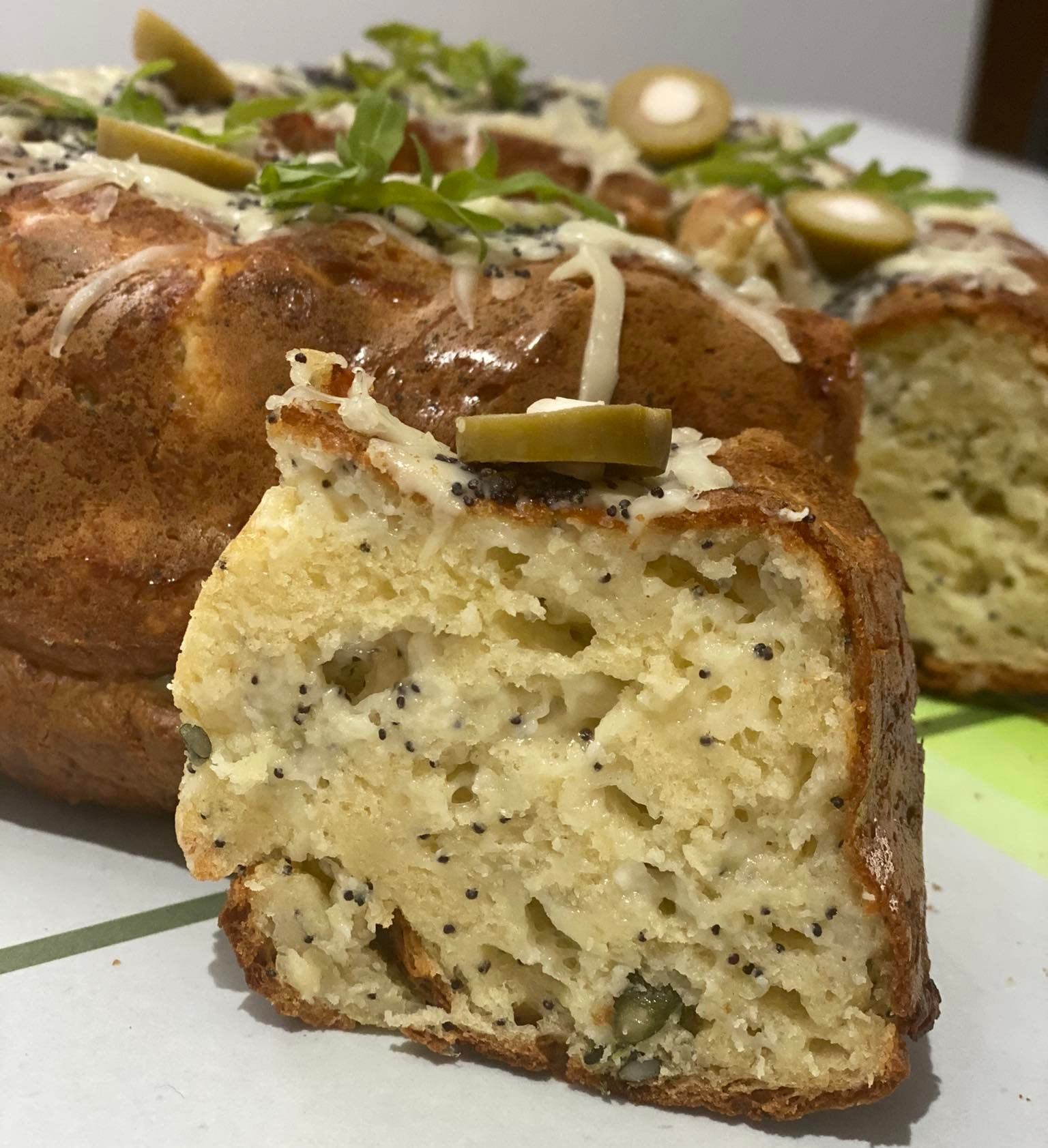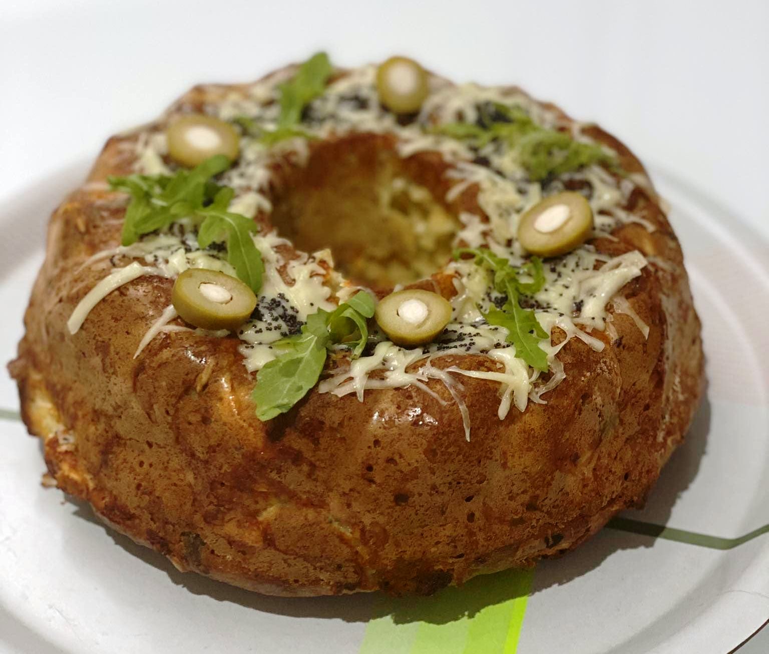 Αφήνουμε το μίξερ στην άκρη. Προσθέτουμε το τυρί και τους ξηρούς καρπούς και ανακατεύουμε. Αδειάζετε το μείγμα σε μια φόρμα για κέικ και ψήνετε αρχικά (περίπου 10-15 λεπτά) σε δυνατό φούρνο, μετά χαμηλώνετε το φούρνο στα 150 βαθμούς.. Οταν είναι ακόμα ζεστό το κέικ, το αναποδογυρίζετε και τρίβετε από πάνω το γκούντα. Τελειώνουμε τη διακόσμηση με πράσινες ελιές και ρόκα!