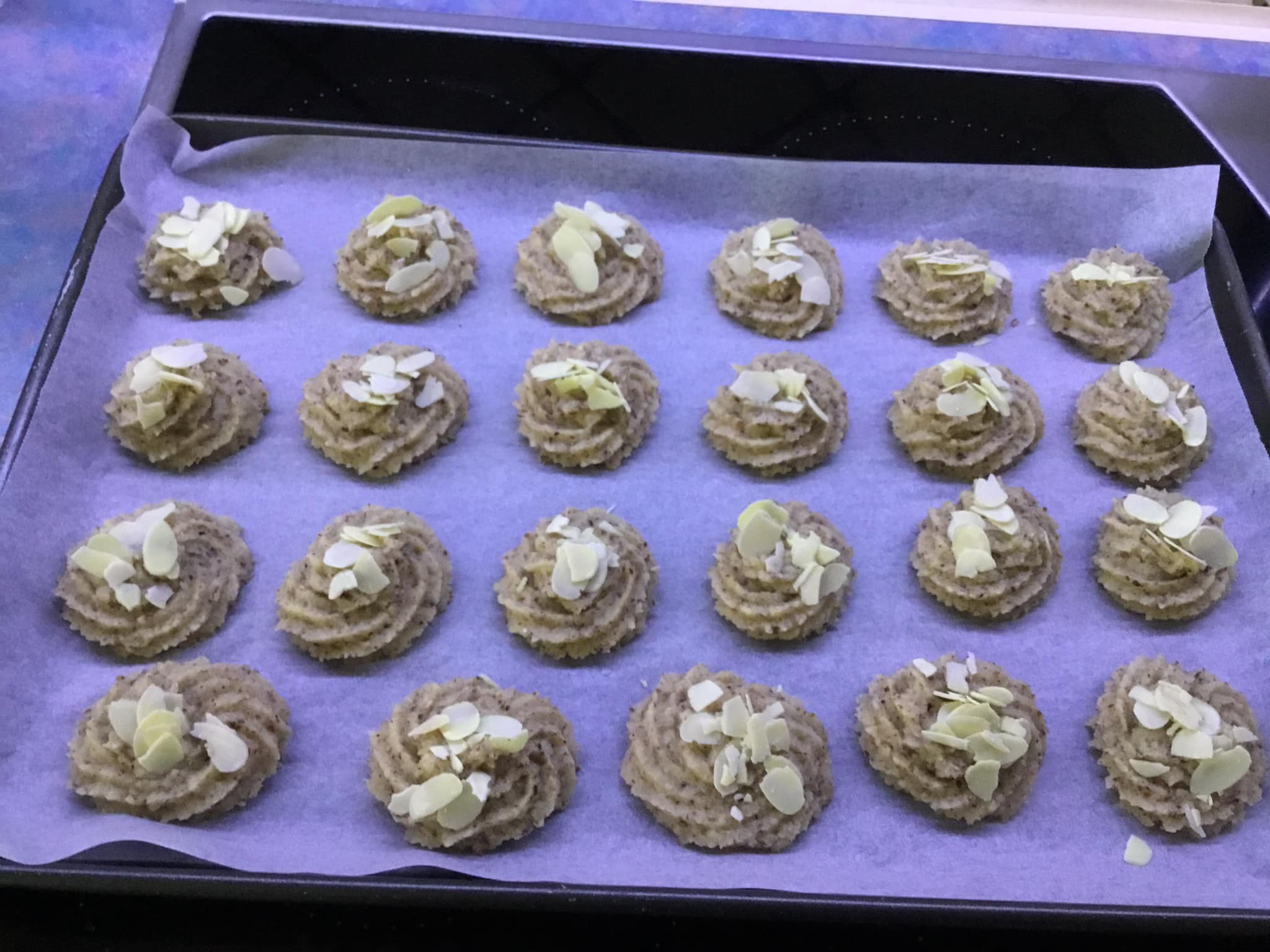 Τοποθετήστε το μείγμα σε μια σακούλα με μια μεγάλη άκρη αστεριού και πλάθετε σε μπισκότα τοποθετώντας τα σε ένα ταψί στρωμένο με χαρτί ψησίματος και επικαλυμμένο με ξεφλουδισμένα αμύγδαλα ή φουντούκια.