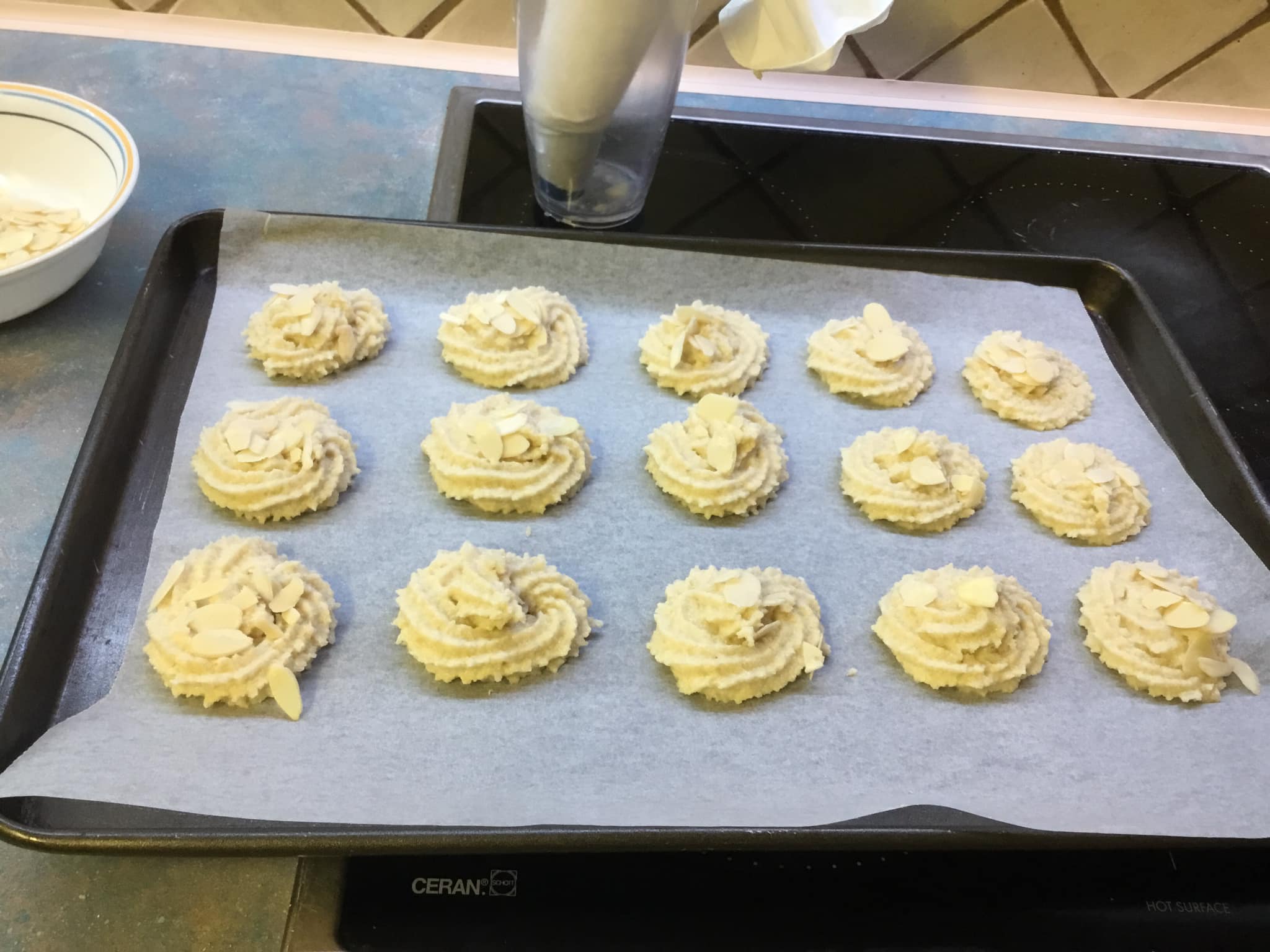 σχηματίσουμε ένα ελαφρώς πεπλατυσμένο μπισκότο. Πιέστε στην κορυφή αμύγδαλα κομμένα αμυγδαλα.