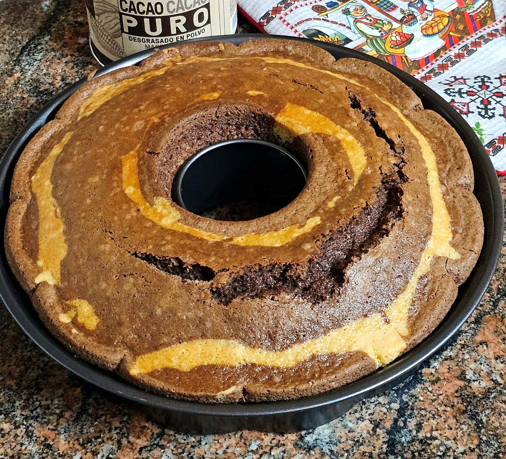 Αδειάζουμε το μισό καφέ μείγμα στη φόρμα του κέικ. Από πάνω ρίχνουμε το λευκό μείγμα και στη συνέχεια το υπόλοιπο καφέ μείγμα.